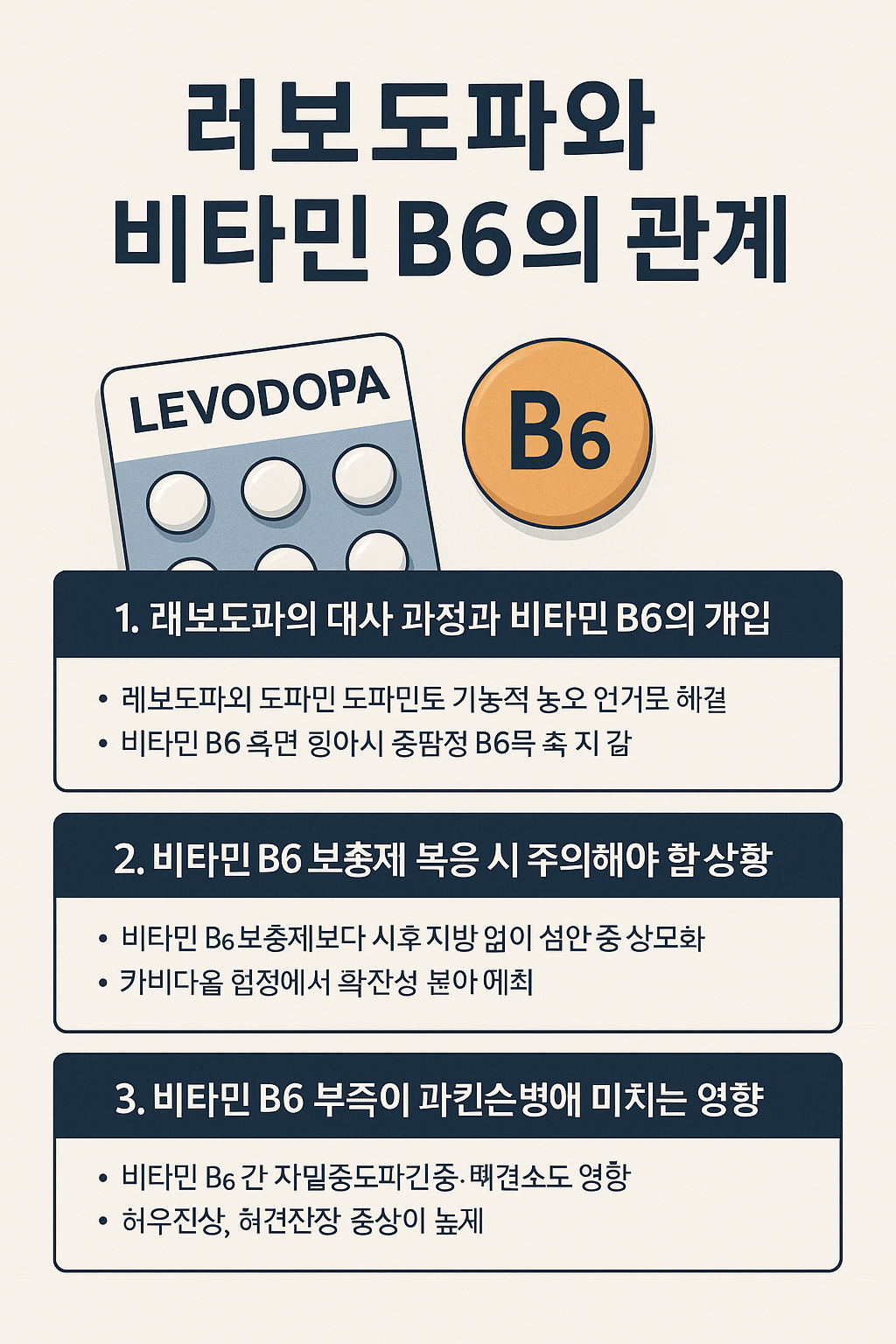 파킨슨병은 중뇌의 흑질 부위에서 도파민 신경세포가 점차 파괴되는 신경계 퇴행 질환입니다. 주로 떨림, 경직, 운동 완만, 보행 장애 등의 증상이 나타나며, 가장 효과적인 치료제 중 하나가 바로 레보도파(Levodopa)입니다. 하지만 이 레보도파와 비타민B6(피리독신) 사이에는 놓치기 쉬운 상호작용이 존재합니다 이번 글에서는 레보도파와 비타민B6의 관계를 3가지 핵심 포인트로 나누어 자세히 알아보겠습니다.