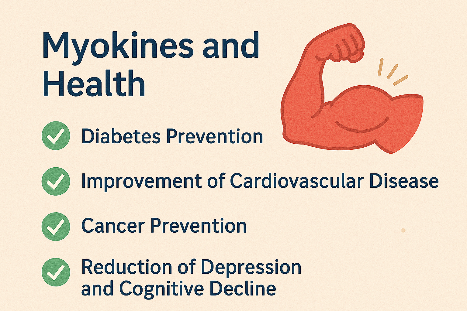 즉, 운동은 단순히 근육을 키우는 것에 그치지 않고, 마이오카인을 통해 전신 건강에 기여하게 되는 것입니다.
