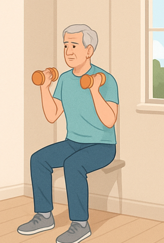 가벼운 아령, 탄력 밴드, 체중을 활용한 스쿼트, 계단 오르기 등이 적합합니다.