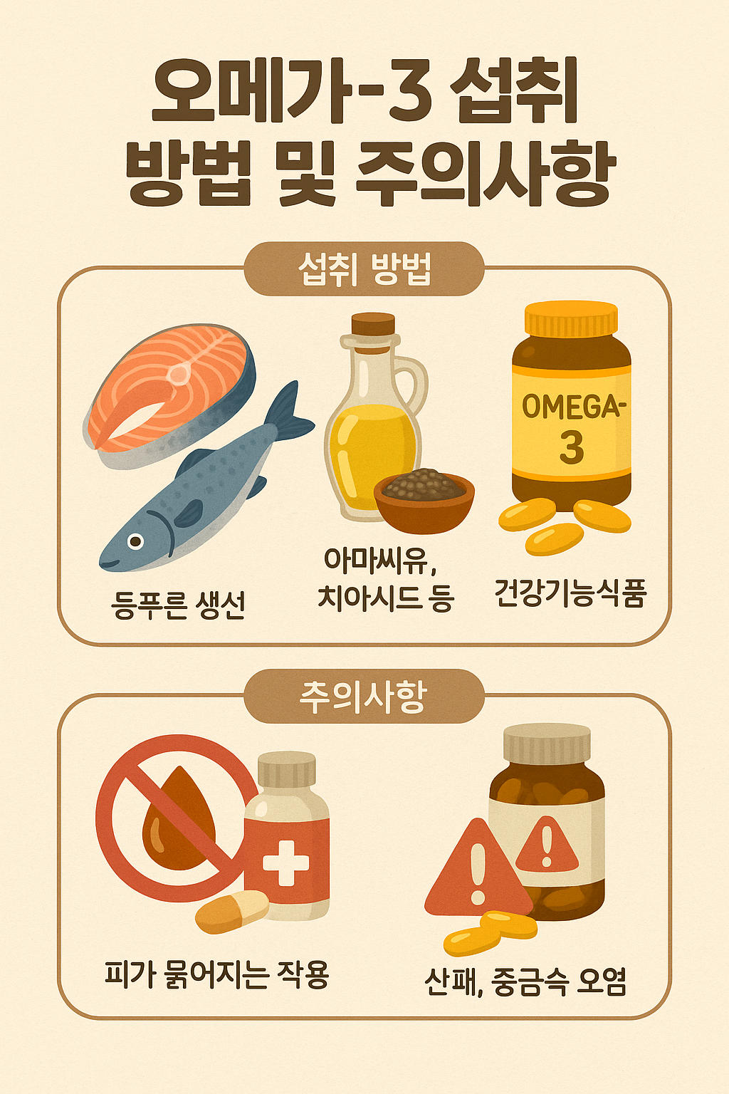 오메가-3 지방산은 음식과 건강기능식품을 통해 섭취할 수 있으며, 일상에서 꾸준히 관리하면 심혈관 건강, 뇌 기능, 염증 조절 등에 큰 도움이 됩니다. 대표적인 오메가-3 공급원은 등 푸른 생선(고등어, 연어, 정어리, 참치 등)이며, 식물성으로는 아마씨유, 치아시드, 들깨유, 호두 등이 있습니다. 하지만 식물성 오메가-3는 주로 ALA 형태로, 체내에서 EPA와 DHA로의 전환율이 낮기 때문에 직접적으로 EPA와 DHA를 섭취하는 것이 더 효과적입니다. 건강기능식품으로 섭취할 경우, 하루 1,000mg 이상의 EPA+DHA 조합이 권장되며, 고함량 제품의 경우 2~3G까지 복용하기도 합니다. 섭취 시간은 식사 중 또는 식후가 좋으며, 지방과 함께 섭취하면 흡수율이 높아집니다. 그러나 오메가-3는 혈액을 묽게 하는 작용이 있기 때문에, 항응고제나 혈압약을 복용 중인 사람은 복용 전에 반드시 의사와 상담해야 합니다. 또한 일부 저가 제품은 산패나 중금속 오염 위험이 있으므로, IFOS, USP, GMP 인증을 받은 제품을 선택하는 것이 안전합니다. 냉장 보관이 필요한 제품도 있으니 보관 방법을 확인하는 것도 중요합니다.